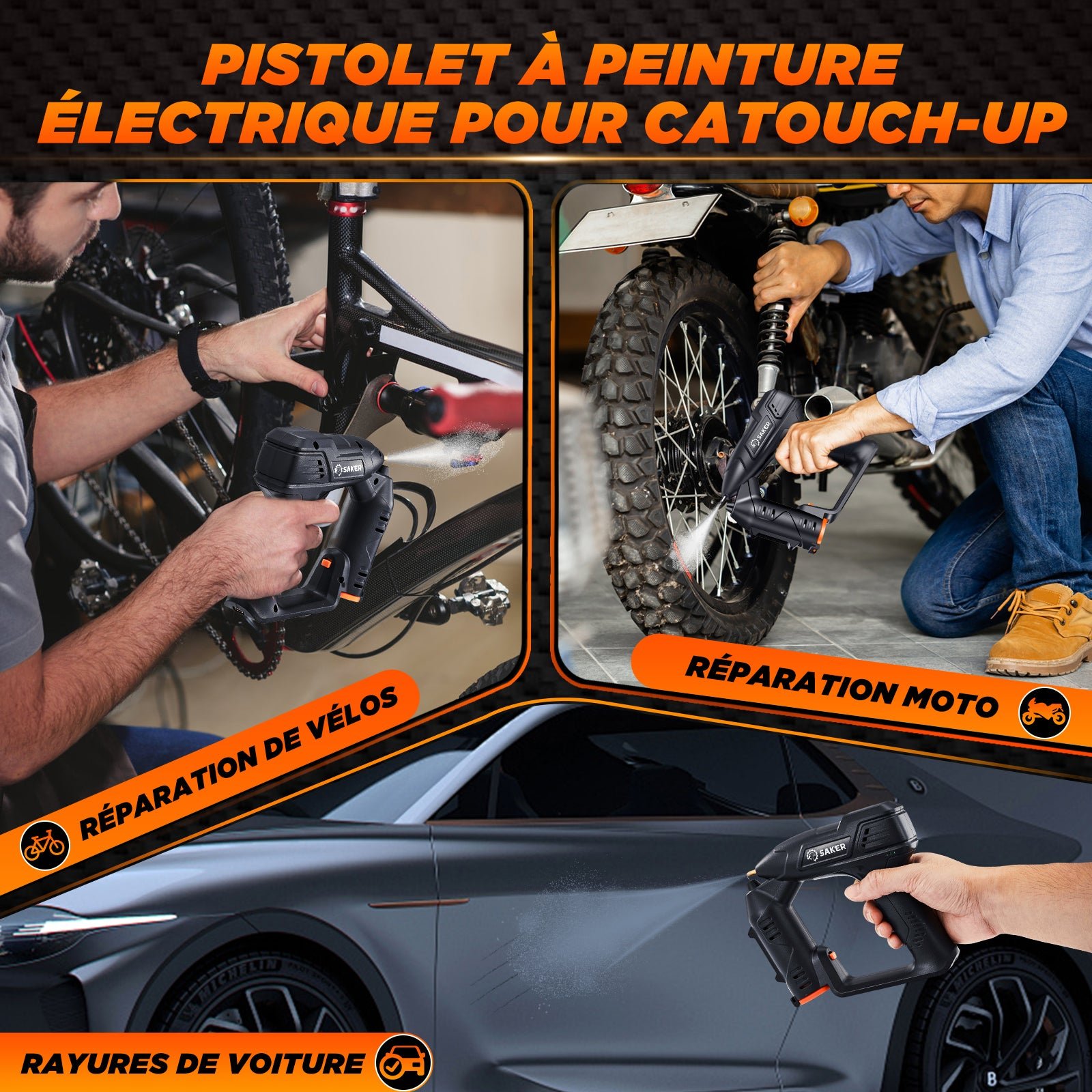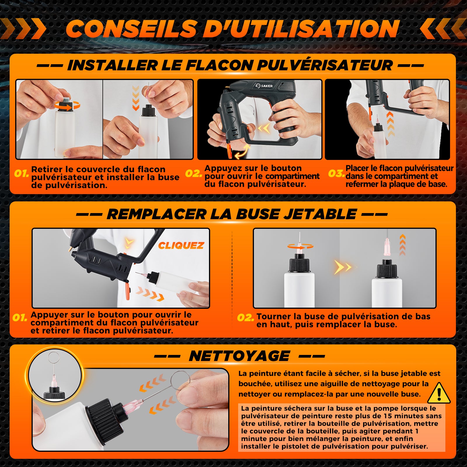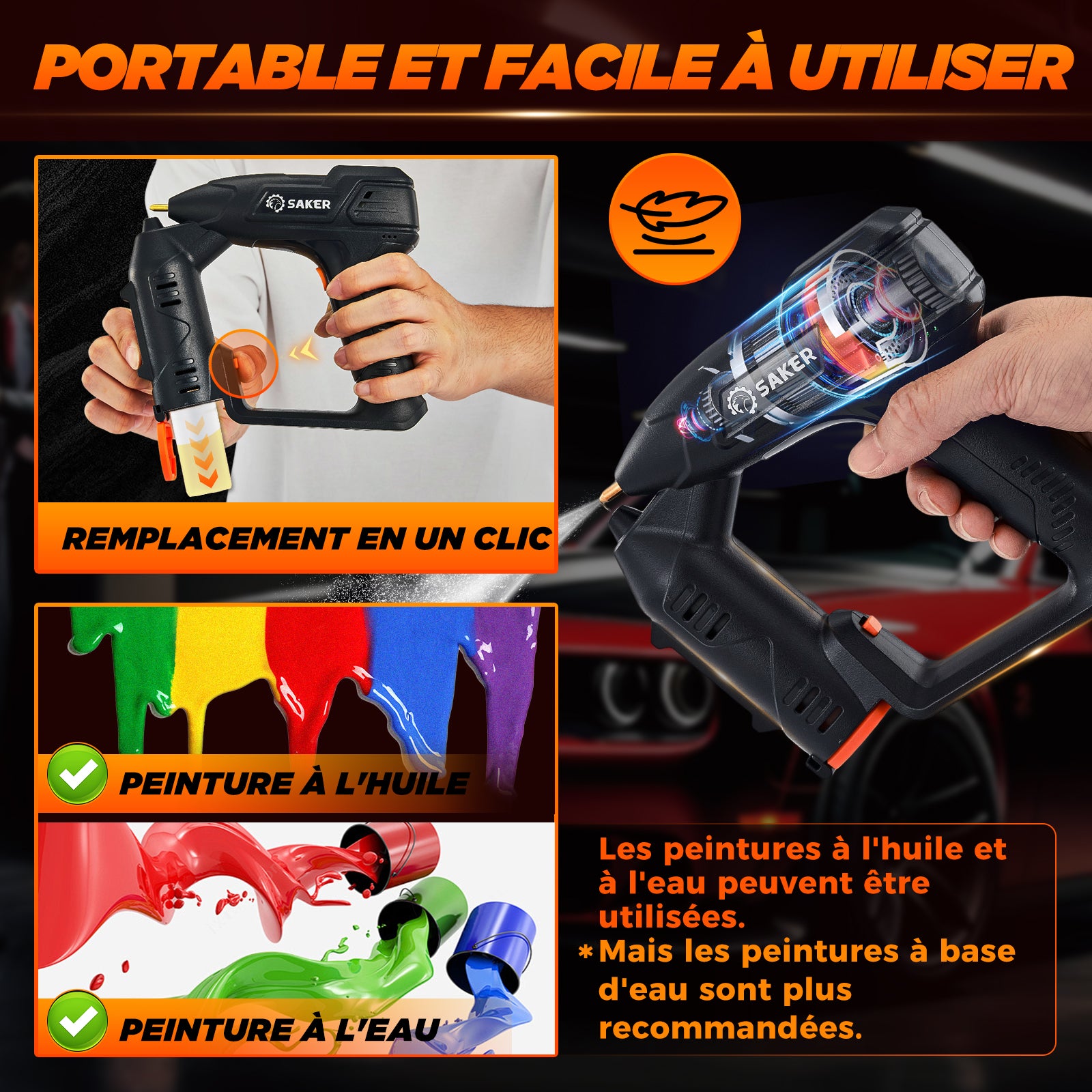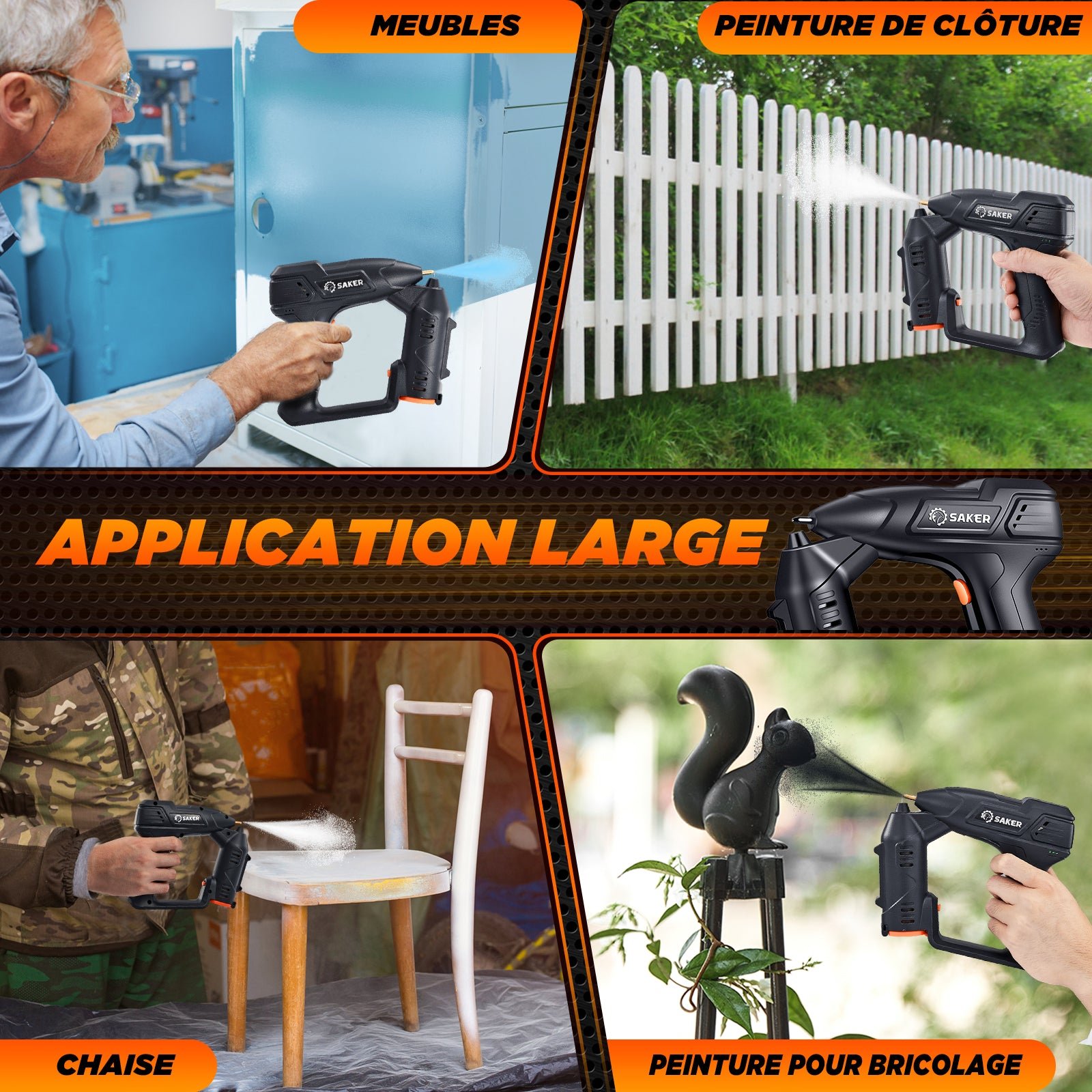 - 【Pratique et portable】Compact et portable, il est facile à transporter et à ranger. Que vous travailliez dans votre garage, votre jardin ou sur un chantier, le pulvérisateur de peinture électrique Saker vous offre flexibilité et commodité.