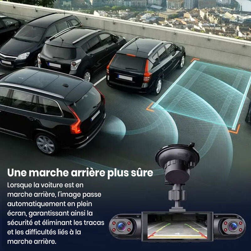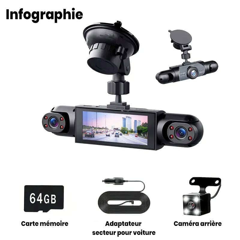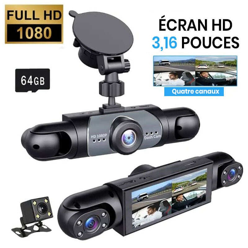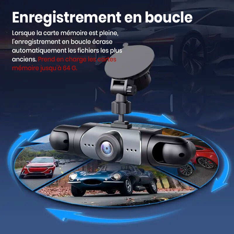 Caméra embarquée à 4 canaux : la caméra embarquée à 4 canaux dispose de 4 objectifs, tous capables d'enregistrer simultanément des vidéos FHD 1080P. Elle peut filmer simultanément l'avant, l'arrière, le côté gauche et le côté droit du véhicule. Les deux objectifs gauche et droit peuvent ajuster l'angle de prise de vue afin que vous puissiez capturer plus de détails à votre guise. Elle peut facilement couvrir 360 degrés, garantissant ainsi qu'il n'y a aucun angle mort autour de la voiture. Vous pouvez utiliser un objectif pour capturer l'intérieur de votre véhicule.