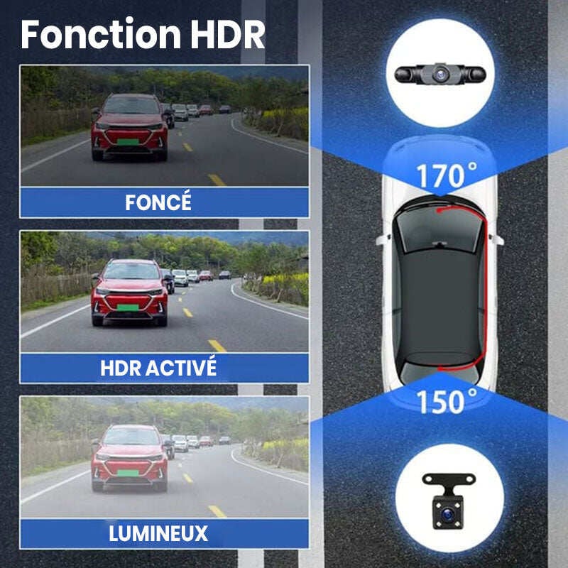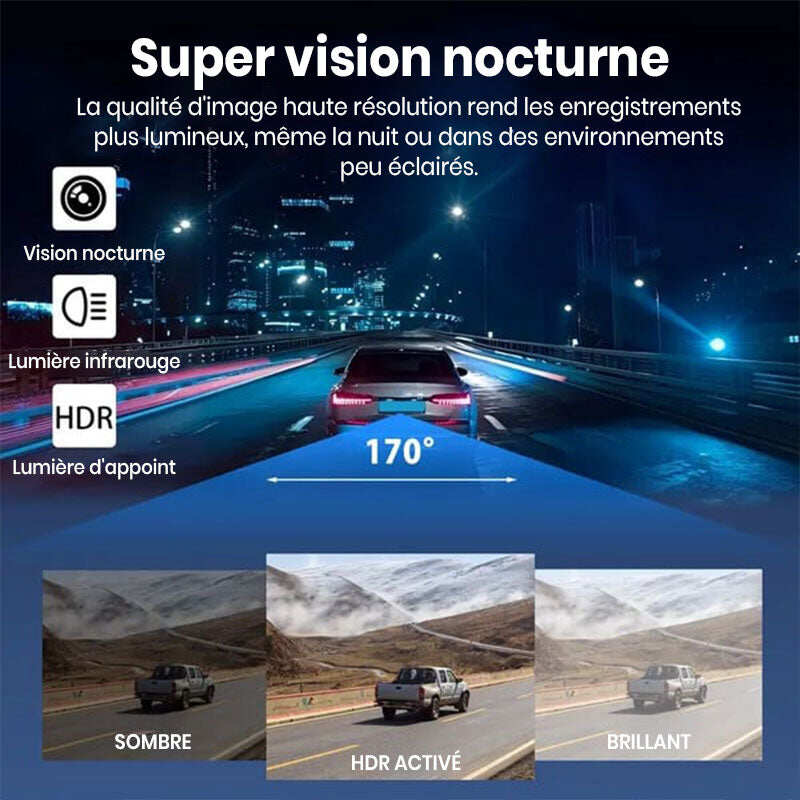Vision nocturne de qualité : la caméra embarquée capture clairement les objets se déplaçant à grande vitesse, même dans des conditions d'obscurité ou de contre-jour. Les caméras avant et arrière intérieures avec lumières infrarouges enregistrent des images nettes de l'habitacle, même dans un environnement non éclairé, ce qui améliore considérablement la sécurité de la conduite de nuit et en fait un choix idéal pour les chauffeurs Uber, Rideshare, Lyft, Taxi, les flottes commerciales et les familles.